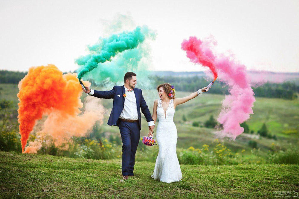 Зеленый цветной дым популярный цвет, на некоторых фотографиях он выглядит бирюзовым. Часто на фотографиях можно встретить, одновременный запуск двух цветов, зеленого и желтого, это хорошая связка. Белорусский дым отличный вариант если вы хотите провести фотосессию при этом хотите держать шашку в руках (но шашка нагревается), этот дым дымит 120 секунд, и вы получите достаточно много фотографий.