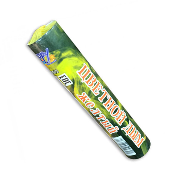 Желтый цветной дым 120 секунд - это яркие краски в серые будни. Этот цвет изменить настроение на любой мрачной фотографии в самую суровую погоду. Заряд долгого дыма в две минуты окутает всех окружающих, подарит множество ярких снимков. К сожалению этот цвет дыма не такой популярный как красный и синий дым, но в сочетании с другими шашками он создает интересную картинку.
