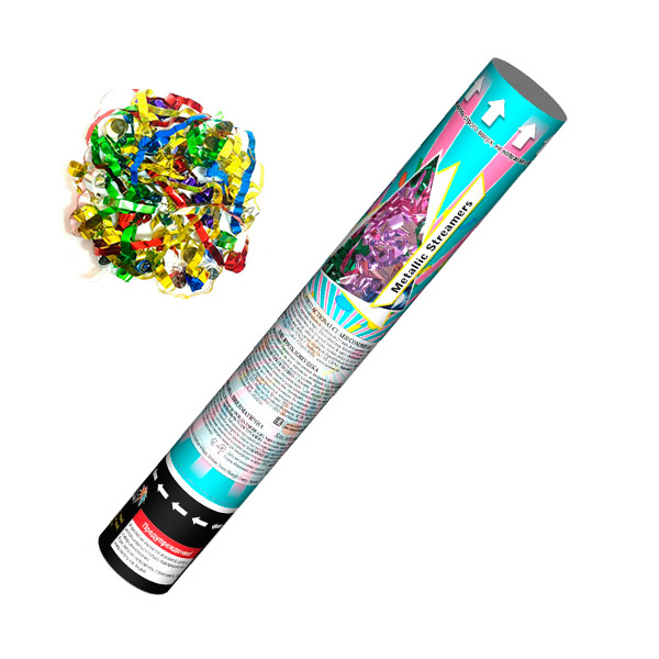 Пневмохлопушка 30 Наполнение - прямоугольники, двухсторонняя фольга, разноцветный серпантин.