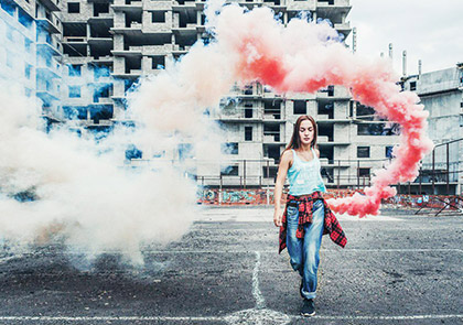 Еще одна интересная идея для фотографий на стройке с применением шашек цветного дыма это фото совместные для парня и девушки в образе маньяка и жертвы. В качестве аксессуаров можно использовать не действующее оружие, веревку, скотч, наручники и др. В этом случае нам так же поможет цветной дым. Он придаст фото дополнительную яркость. Передаст эмоции девушки.